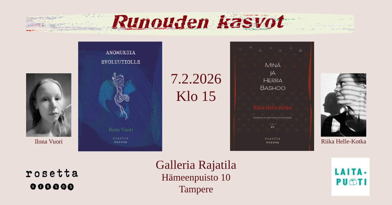 Tervetuloa! Runoilija Ilona Vuori kertoo kirjastaan “Anomuksia evoluutiolle”, jossa runot luotaavat leikkisästi kohti pysymistä ja katoamista, ajan kulun mieltä sekä tietämisen rajoja. Riika Helle-Kotkan haibun käsittelee aikaa runokokoelman ja matkakertomuksen hybridissä “Minä ja Herra Bashoo”. Siinä 1600- ja 2000-luku yhdistyvät Honshun saarella haikumestari Bashoon jalanjäljissä selviytymistarinaksi. Nämä Rosetta Versoksen kustantamat kirjat ovat saatavilla gallerian yhteydessä toimivasta Laitapuodista.